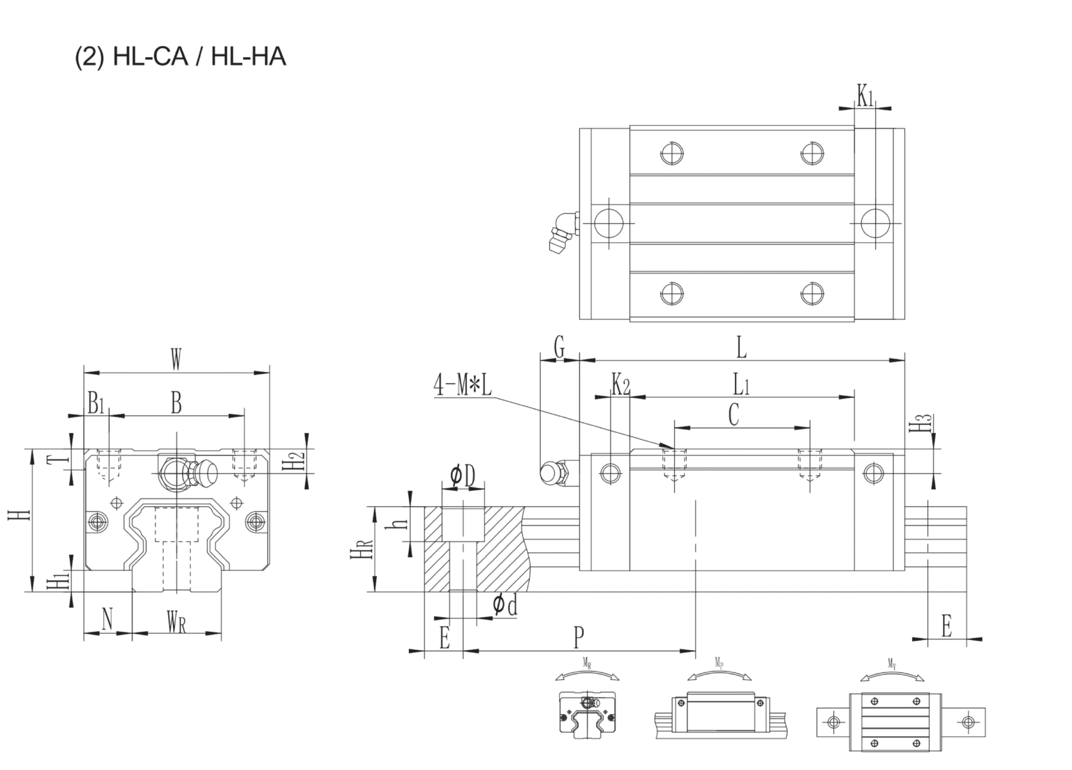 H | H1 | N | W | B | B1 | C | L1 | L | K1 | K2 | G | MxL | T | H2 | H3 | WR | HR | D | h | d | P | E | (mm) | C(kN) | C0(kN) | ||||||
