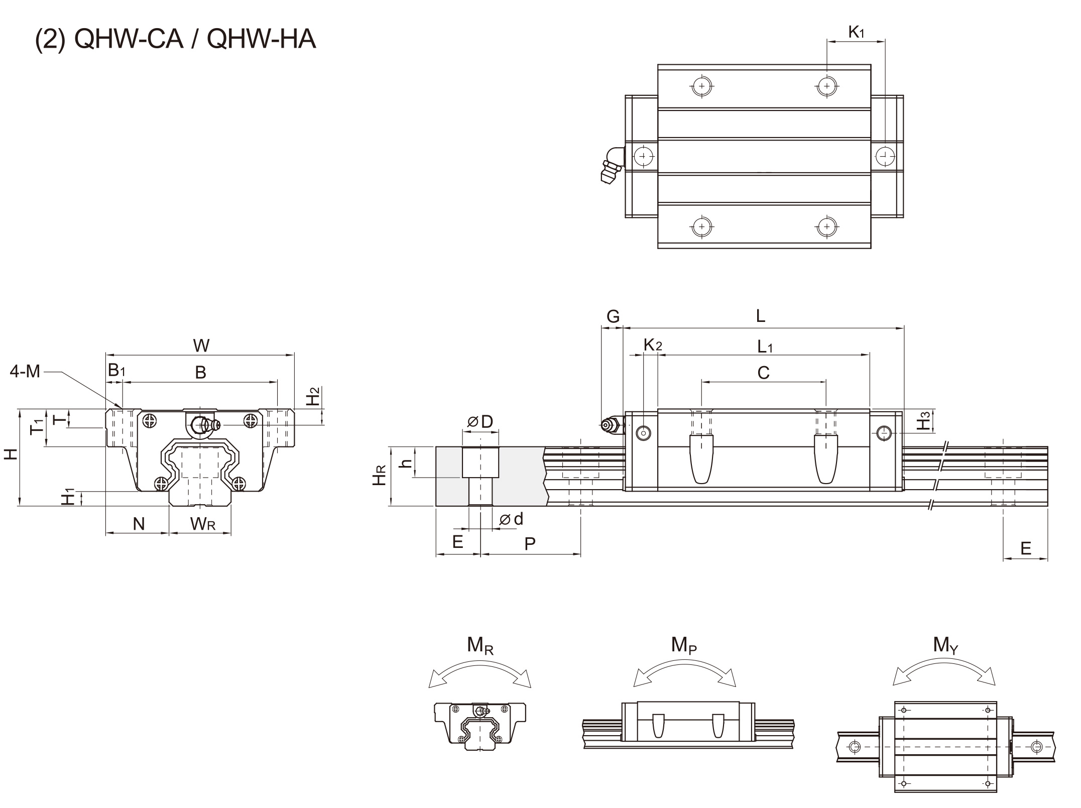 H | H1 | N | W | B | B1 | C | L1 | L | K1 | K2 | G | M | T | T1 | H2 | H3 | WR | HR | D | h | d | P | E | (mm) | C(kN) | C0(kN) | ||||||