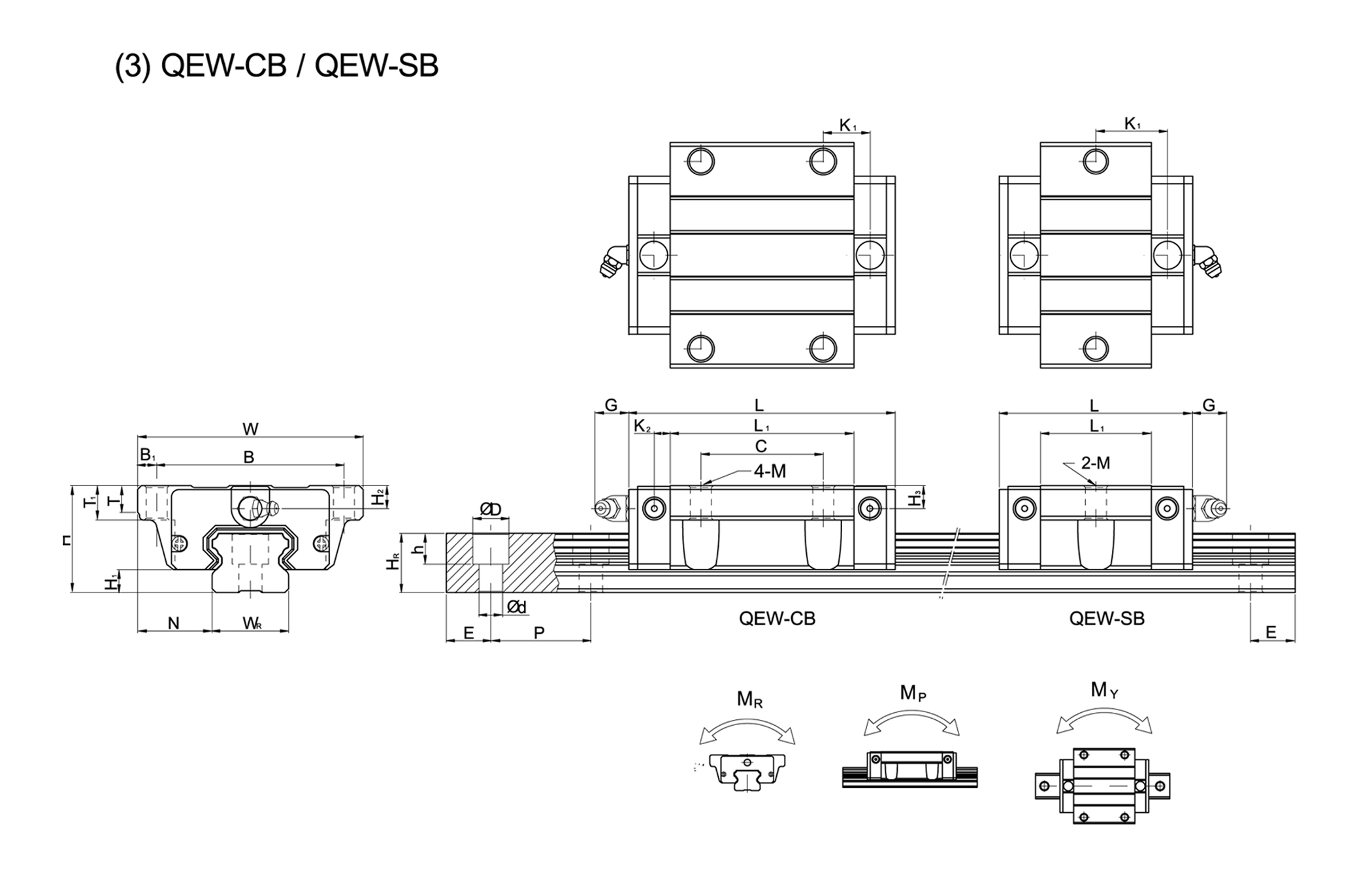 Model NO. | Dimensions of | Dimensions of | Dimensions of | Mounting Bolt for Rail | Basic Dynamic Load Rating | Basic Static Load Rating | Static Rated Moment | Weight | ||||||||||||||||||||||||