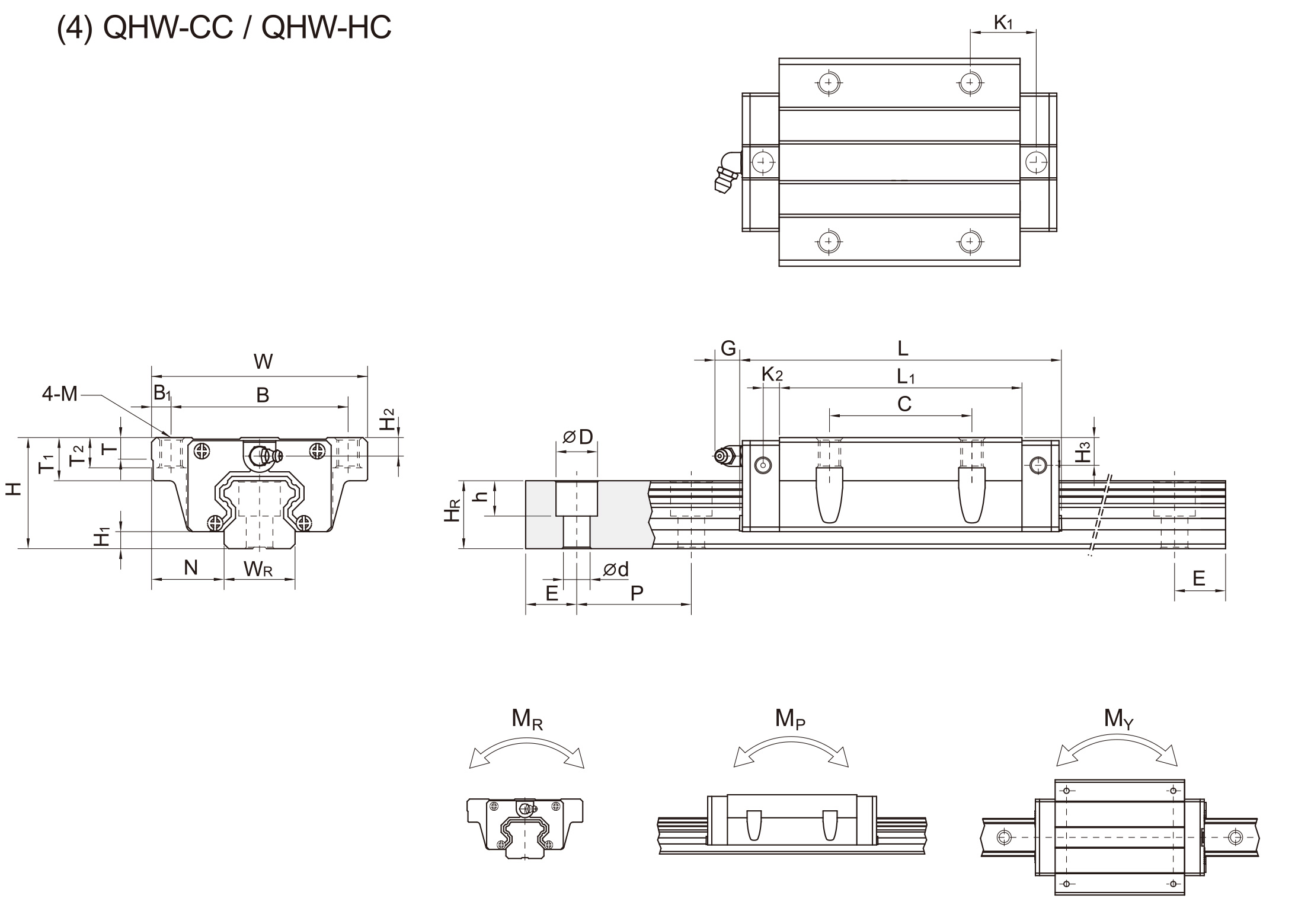 Model NO. | Dimensions of | Dimensions of | Dimensions of | Mounting Bolt for Rail | Basic Dynamic Load Rating | Basic Static Load Rating | Static Rated Moment | Weight | |||||||||||||||||||||||||