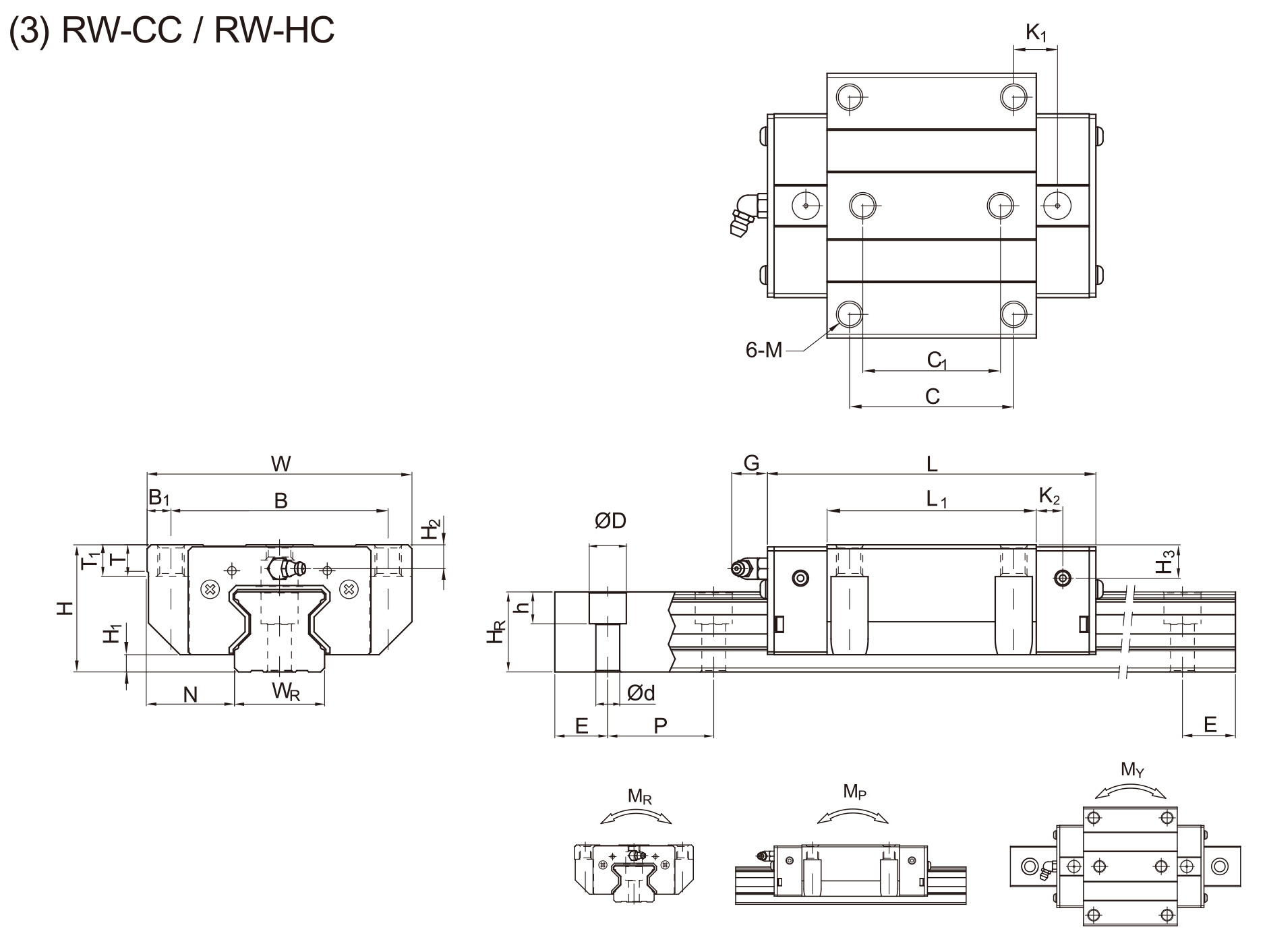 Model NO. | Dimensions of | Dimensions of | Dimensions of | Mounting Bolt for Rail | Basic Dynamic Load Rating | Basic Static Load Rating | Static Rated Moment | Weight | |||||||||||||||||||||||||
