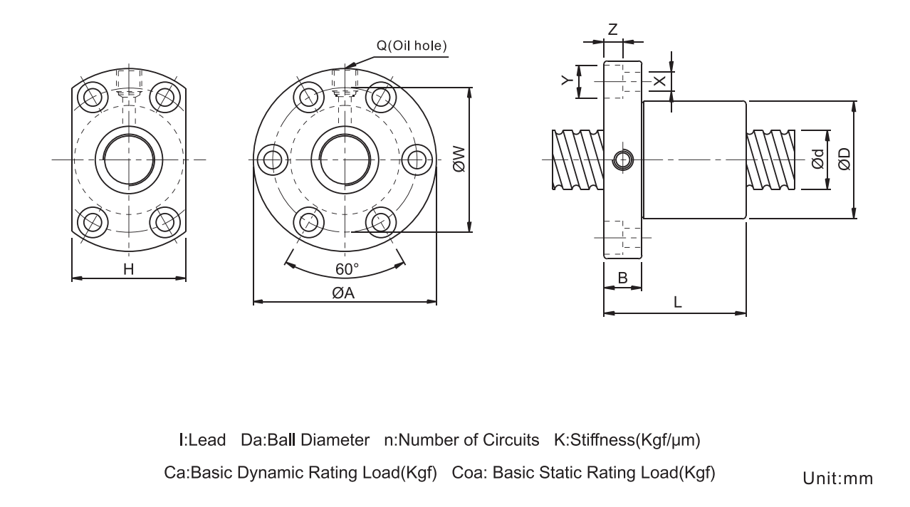 | D | A | B | L | W | H | X | Y | Z | Q | n | Ca(kgf) | Coa(kgf) | |||||